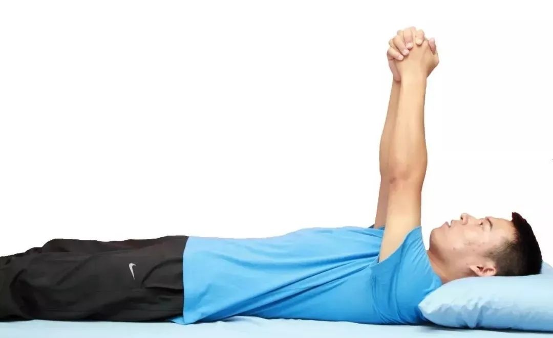 用健侧手与患手交叉于胸前,患手拇指压在健手拇指上,然后健手带动患手用力前举或上举过头,直至两肘关节完全伸直,保持10s后复原,重复20次。