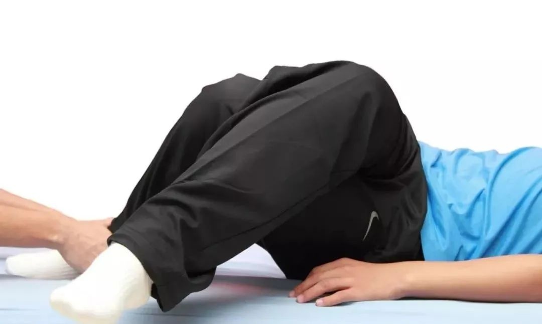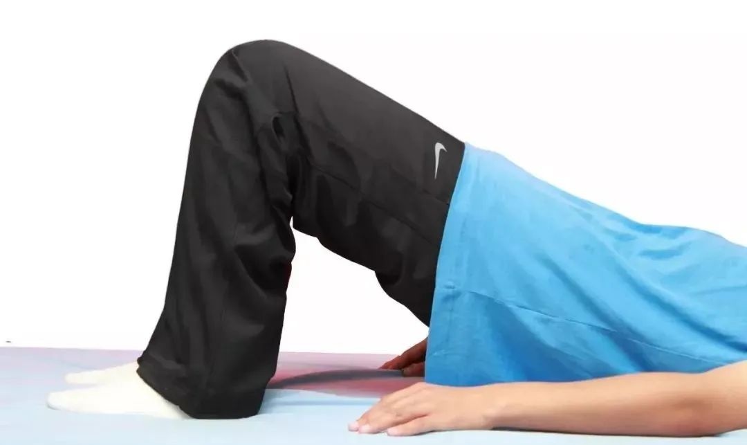 两上肢伸展置于体侧,两下肢区屈髋、曲膝位,可用枕或由家属或治疗人员将患侧下肢固定或将患腿翘于健膝上,然后尽量抬臀离开床面,保持10s,重复作5-10次。注意动作过程中不应有屏气动作。