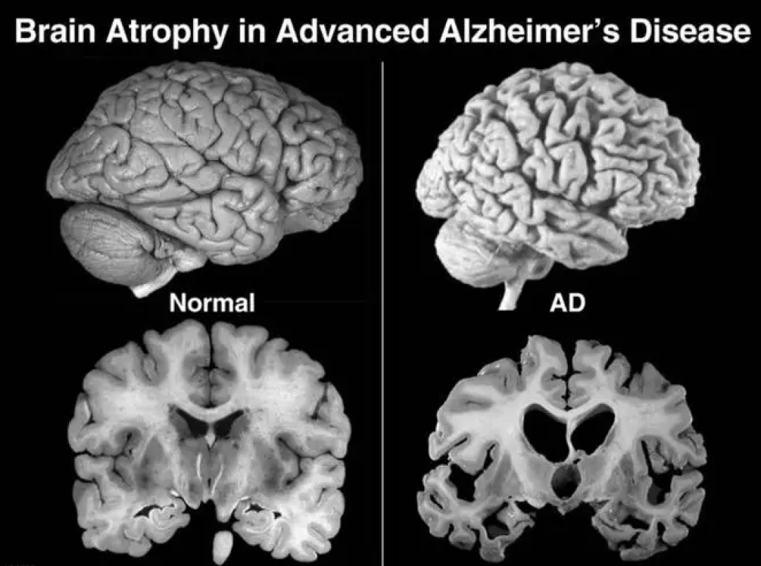 晚期阿尔茨海默症患者的脑萎缩状况(右)