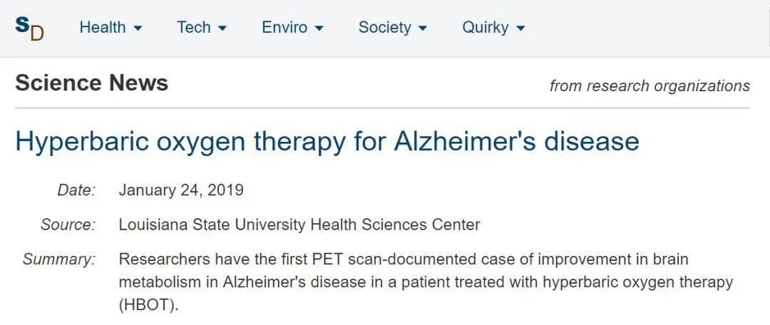 路易斯安那州立大学健康新奥尔良医学院(LSU Health New Orleans School ofMedicine )临床教授、高压氧医学主任Paul Harch博士和北达科他州医学院(University of North Dakota School of Medicine )放射科主任Edward Fogarty博士报告了第一例PET扫描记录用高压氧疗法(HBOT)治疗阿尔茨海默症患者脑代谢改善的病例。