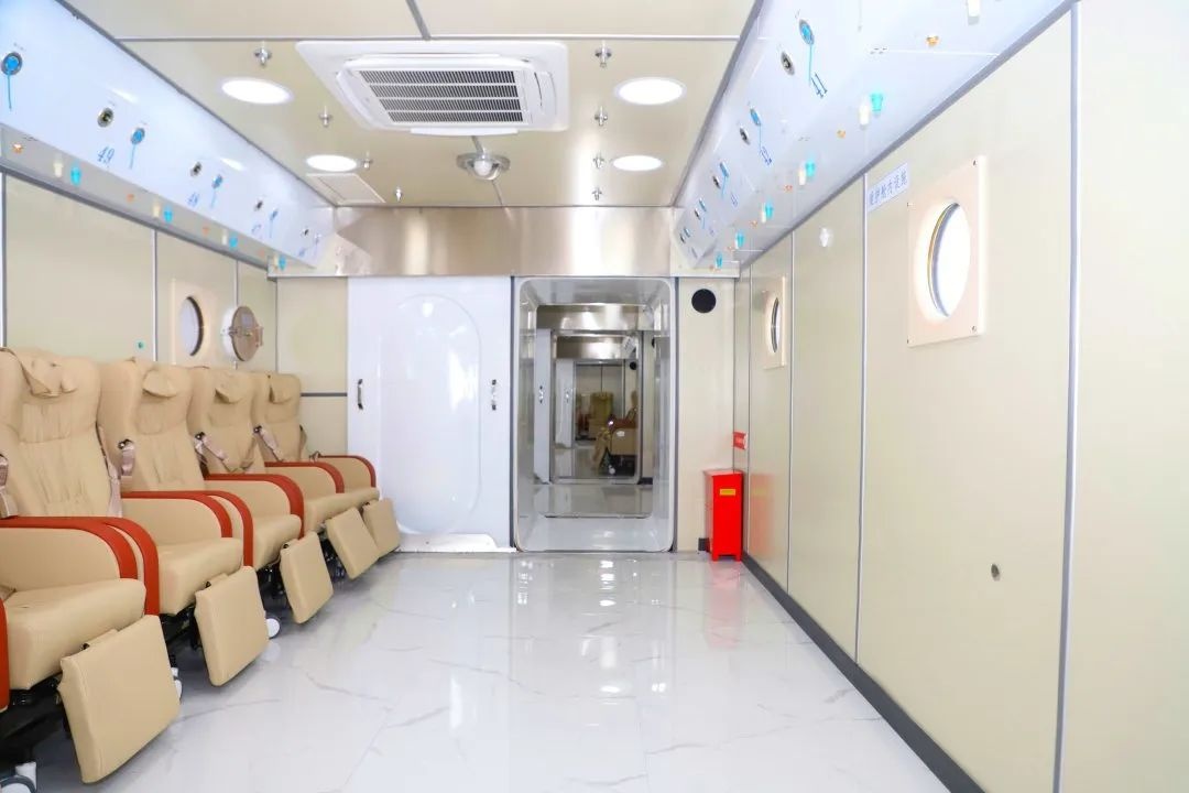 和传统单人氧舱或多人圆舱不同,我院高压氧氧舱采用大内径的方舱设计,如同进入高铁车厢,没有压迫感和空间闭塞感。即使是有幽闭恐惧症或类似症状的患者也能没有压力的入舱治疗。
