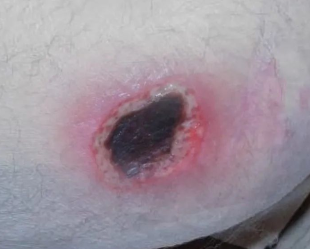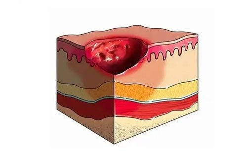 4、第三期压疮浅度溃疡期——表皮破损、溃疡形成。