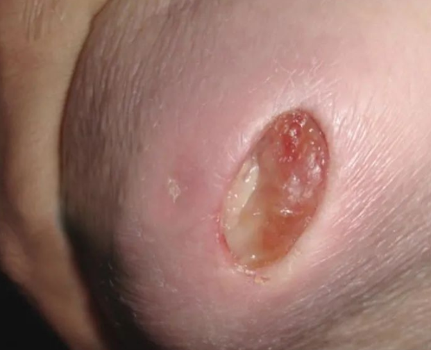 表现为一个浅的开放性溃疡,伴有粉红色的伤口床(创面),无腐肉,也可能表现为一个完整的或破裂的血清性水疱。