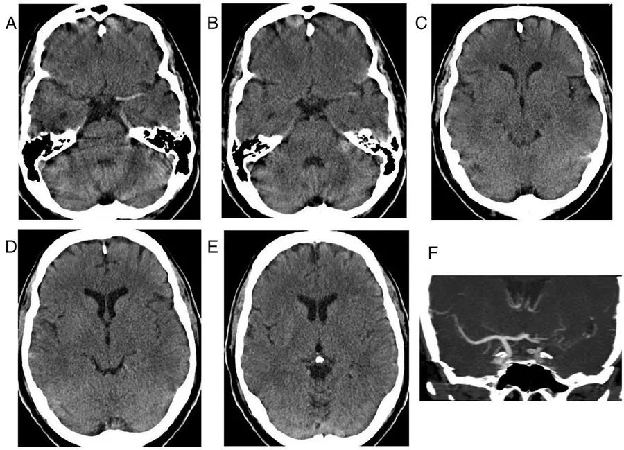 图1 60岁男性,急性缺血性脑卒中,A~E:CT平扫;F:血管造影冠状位重建