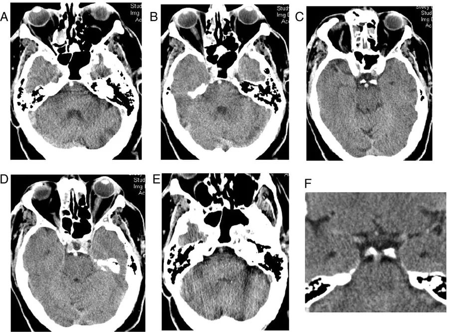 图2 66岁男性,头晕发作数小时后失去意识,A~D:就诊时的CT平扫;E、F:2周前的CT平扫