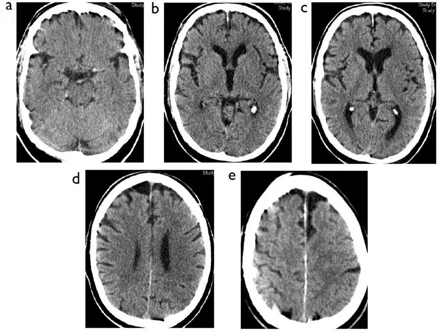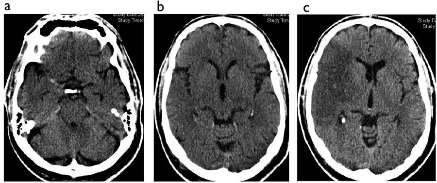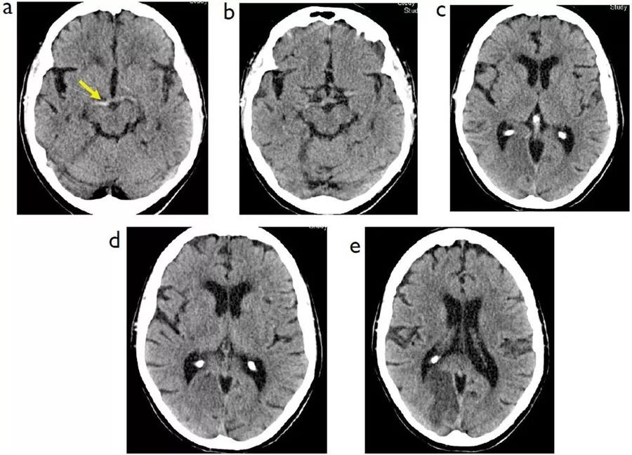 本例患者为右侧大脑后动脉的高密度征。在最初就诊时,患者的脑实质显得很正常,而在36小时后,患者右侧枕叶和右前丘脑出现密度降低。5天后,患者脑内的梗死灶演变成了明显的低密度,边界较清晰。