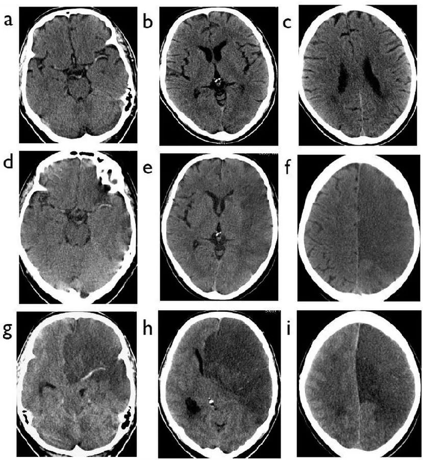 图6 65岁男性,左颈内动脉闭塞合并右侧偏瘫,A~C:初始CT;D~F:24小时后CT;G~I:48小时后CT