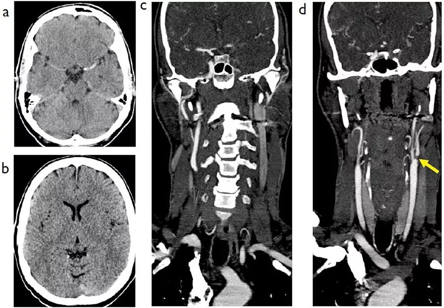 CT平扫中可见左侧大脑中动脉高密度征,同时基底节区灰白质界限模糊,岛叶和豆状核显示欠清。CTA确认了左侧颈总动脉和大脑中动脉M1段的闭塞,左颈动脉球和颈内动脉起始部位可见严重狭窄(图中箭头),这种血管狭窄需要在取栓术后进行血管成形术治疗。
