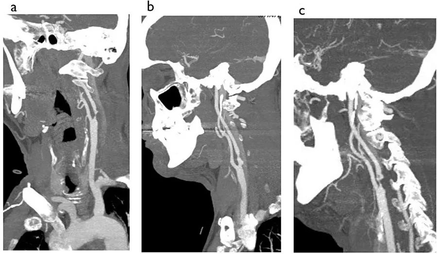 图8 65岁男性,左侧大脑半球短暂性脑缺血发作,图为包括主动脉弓、颈部和颅内动脉的CTA,A:斜冠状位;B:矢状位;C:斜矢状位