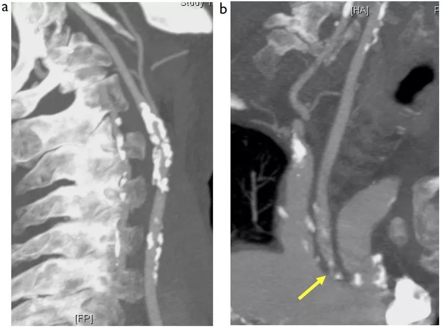 本例患者的左颈动脉区域可见串联状病变,左颈内动脉起始处有密集的钙化斑块,造成血管的严重狭窄,同时左侧颈总动脉也可见严重狭窄(图中箭头)。不过,超声扫描并未检出左颈总动脉的病变。这种在血管分叉处密集的不规则斑块钙化会使测量精确的管腔尺寸变得更困难。