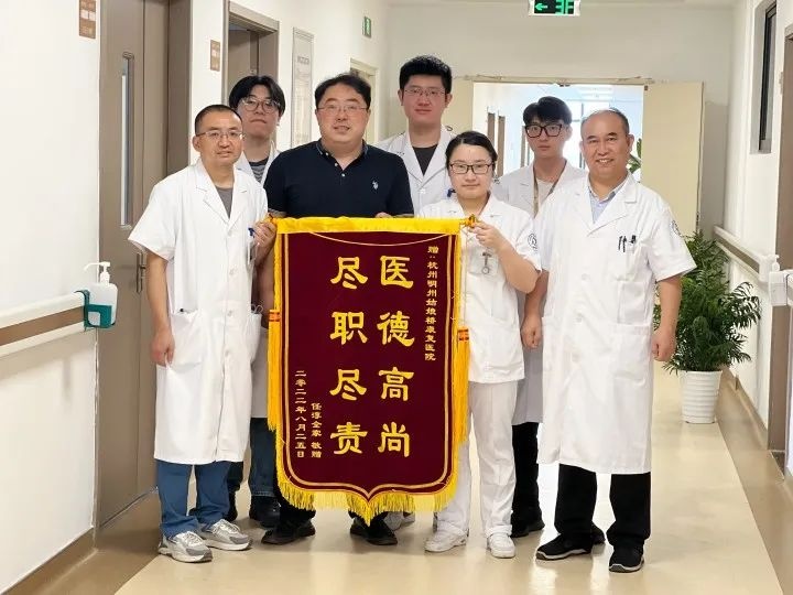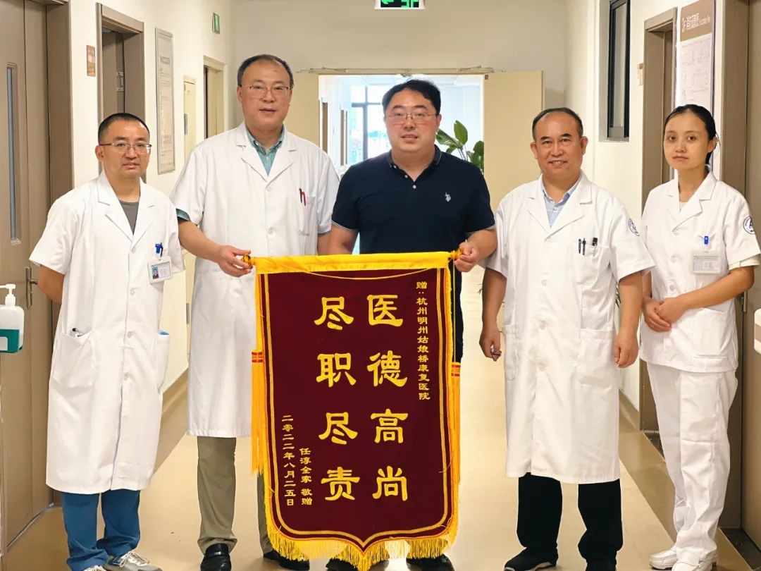 8月26日,家住拱墅区的任先生从主城区赶到萧山,将一面印着“医德高尚 尽职尽责”字样的锦旗送到杭州明州姑娘桥康复医院的医护人员手中,再三感谢住院期间医院给予的精心治疗和护理。