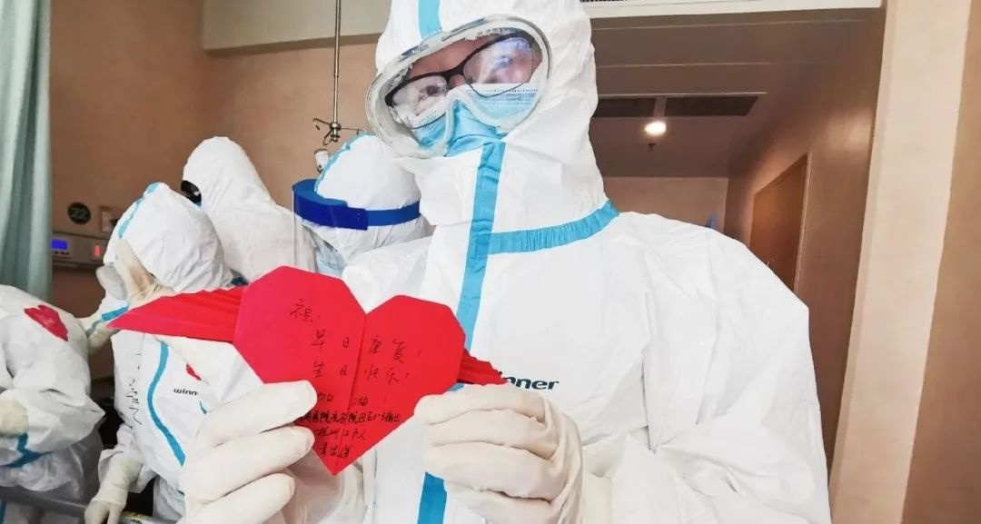 一群写着“生日快乐”的防护服,围绕床边