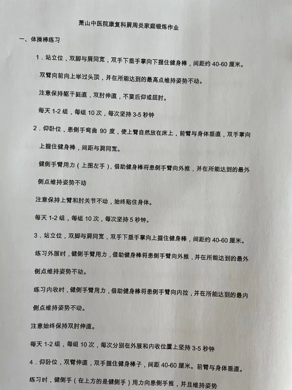 杨波向张阿姨一一解释了家庭作业中的几个动作,并进行了指导以确保张阿姨做起来规范有效,还提出了一些注意事项。张阿姨拿着这张家庭作业,回家坚持锻炼,一个月后,肩周炎的症状明显改善。
