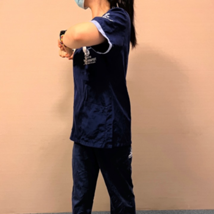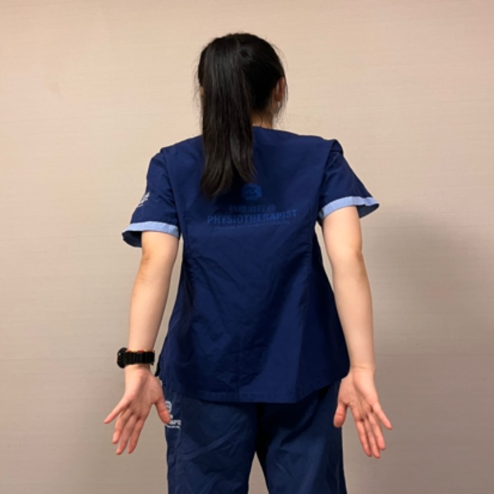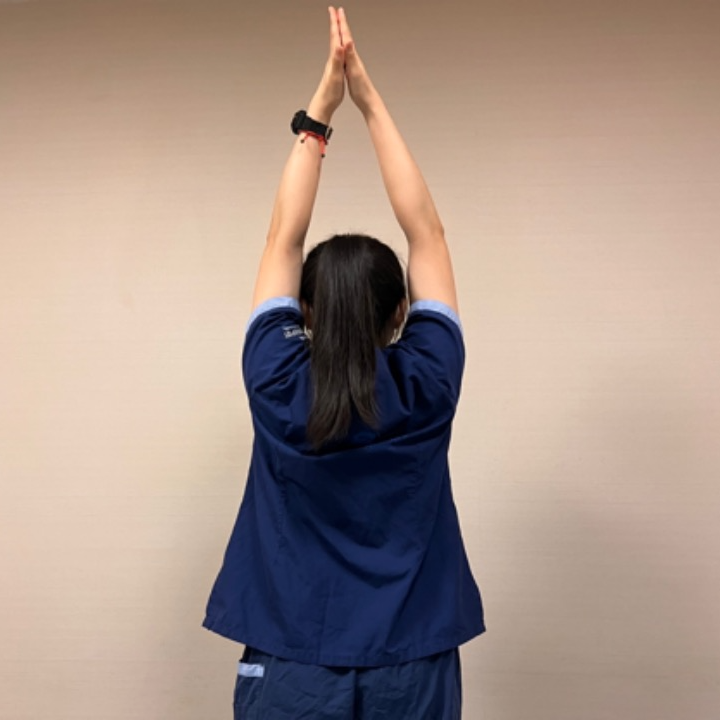②上肢:双手臂高举过头停留数秒然后向下在背后两侧,反复多次