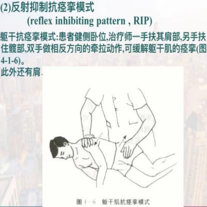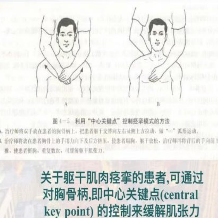 2、Bobath技术:通过利用关键点的控制、反射抑制模式和良肢位的摆放来抑制痉挛。