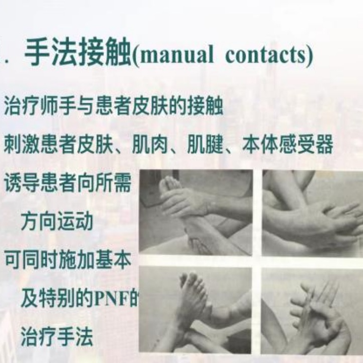 3、神经肌肉本体促进技术(PNF技术):利用牵张、关节压缩和牵引、施加阻力等本体刺激和应用螺旋、对角线状运动模式来促进运动功能恢复的一种治疗方法。