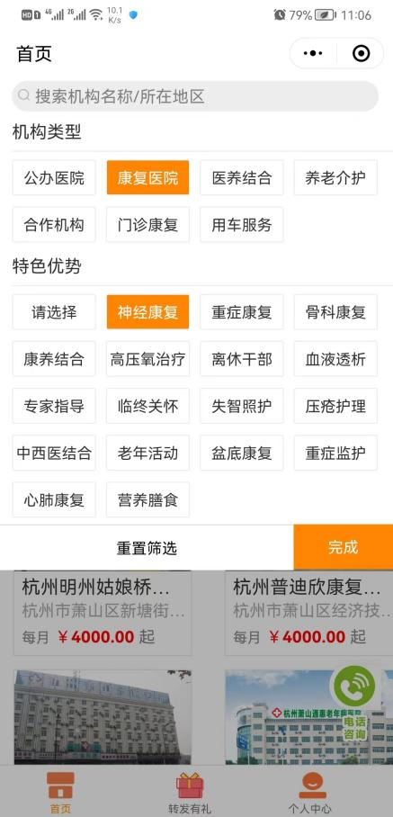 4、进入条件筛选界面,机构类型选择“康复医院”,特色优势选择“神经康复”,点击“完成”,还可根据需求选择“距离”“地区”以及“价格区间”