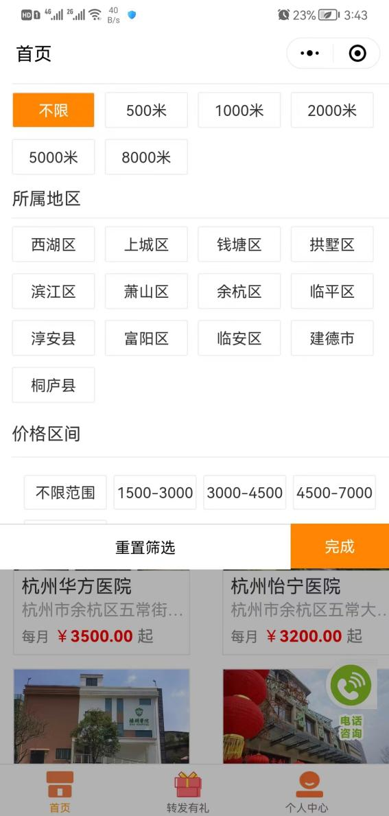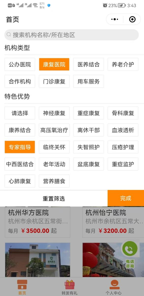 4、进入条件筛选界面,机构类型选择“康复医院”,特色优势选择“专家指导”,点击“完成”,还可根据需求选择“距离”“地区”以及“价格区间”