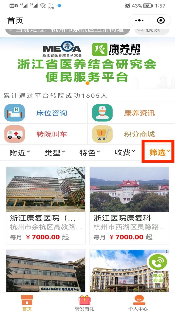 3、进入“智慧康养小程序”主界面,点击“筛选”按钮