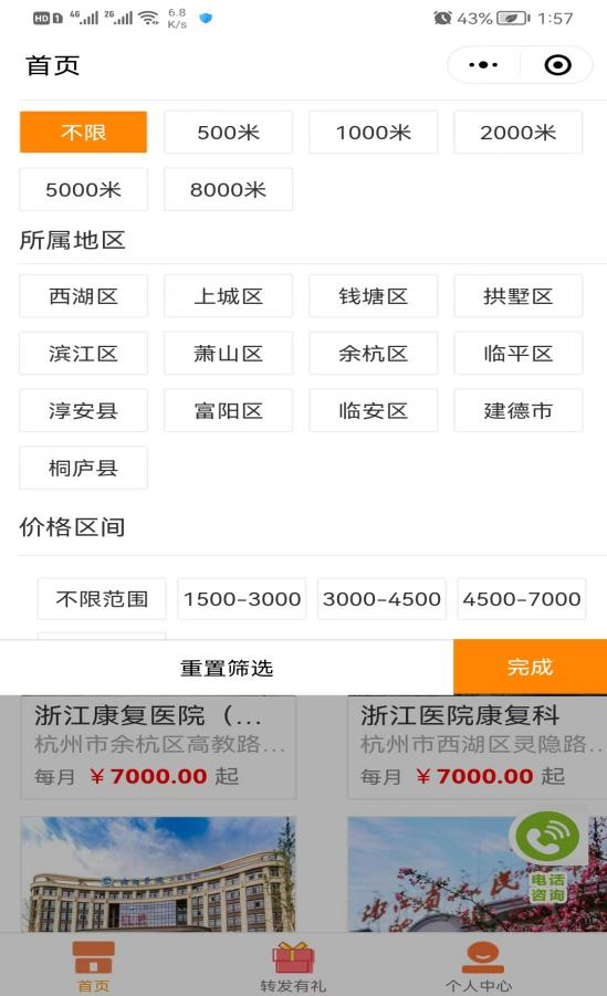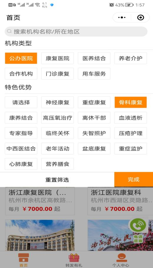 4、进入条件筛选界面,机构类型选择“公办医院”,特色优势选择“骨科康复”,点击“完成”,还可根据需求选择“距离”“地区”以及“价格区间”