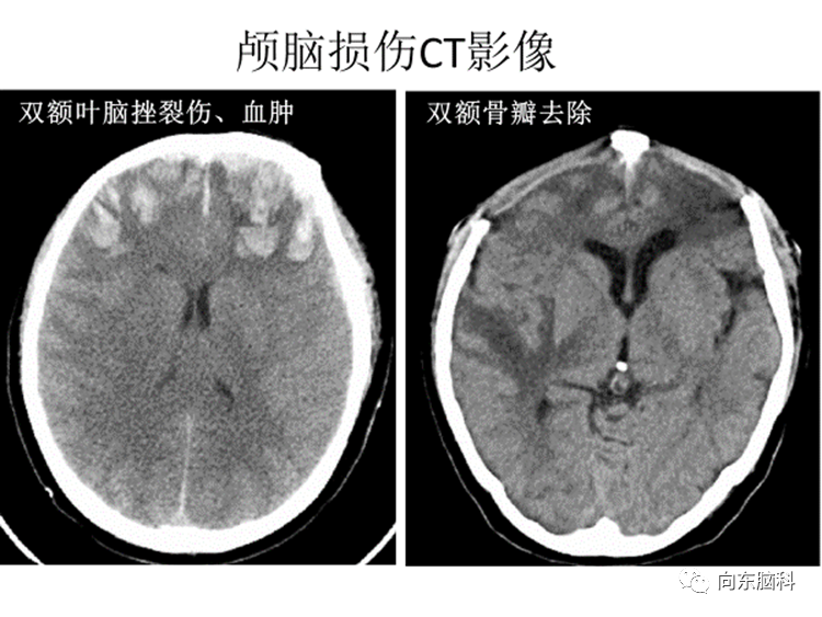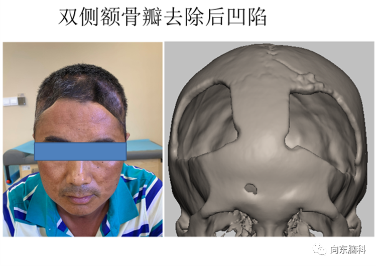 例如上图这位患者因为车祸致致双额叶脑挫裂伤,脑出血,脑水肿、导致颅内高压,为了挽救他的生命,手术去除了双侧的额骨,等到患者病情稳定和好转,脑水肿减退,颅内压恢复正常以后,CT扫描3D影像重建可见双侧额部明显的凹陷