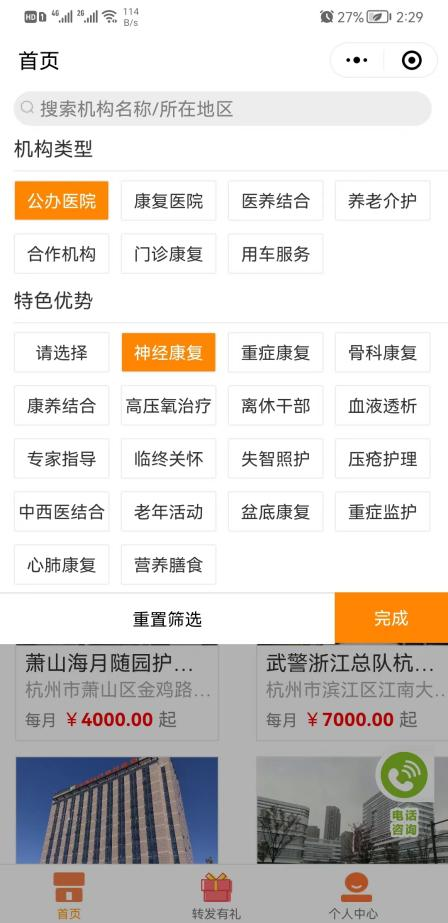 4、进入条件筛选界面,机构类型选择“公办医院”,特色优势选择“神经康复”,点击“完成”,还可根据需求选择“距离”“地区”以及“价格区间”