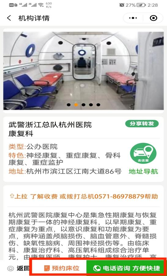 6、点击医院名称,进入该医院详情介绍页面,了解详细信息,在医院介绍页面底部可预约床位或电话咨询