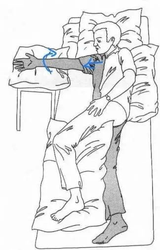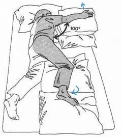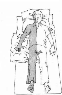 患侧肩膀前举100度,肘、腕、指关节伸展,放在胸前的枕头上。患侧腿屈曲向前放在身体前面的另一枕头上。枕头高度适中,使手和脚平行于床面最佳,避免水肿。