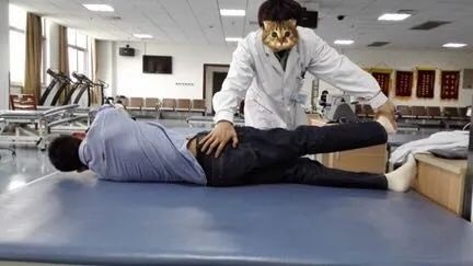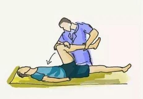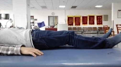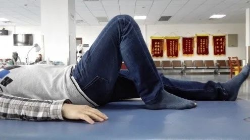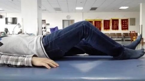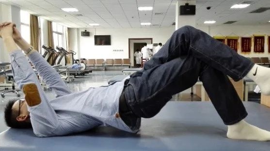 患者双手叉握。家属帮助患者带患腿向前至健腿上,必要时可给予协助转动肩胛或者骨盆。(图片右侧为患侧)