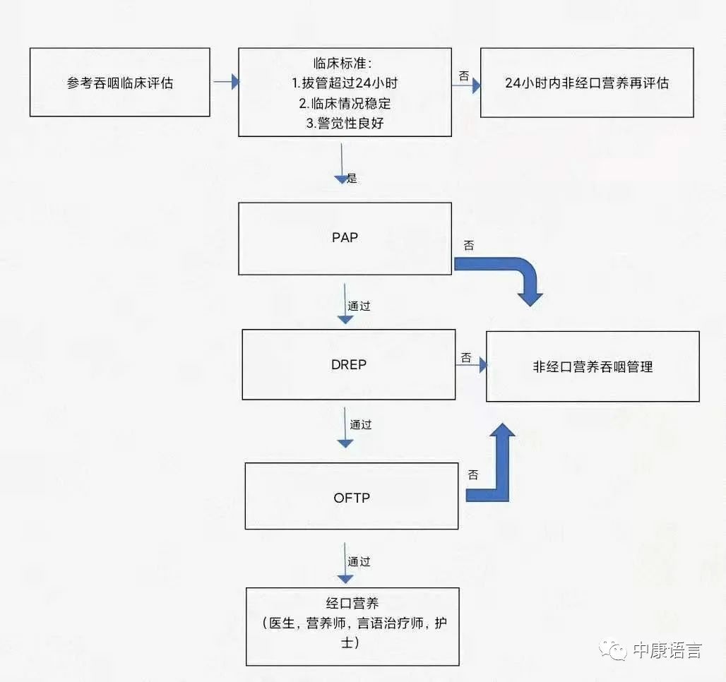 基于多学科团队的医疗记录和报告的参考和指导下完成了临床吞咽评估。如果患者警觉性良好且临床情况稳定,则在拔管后24小时进行全面评估。我们机构ICU的完整临床吞咽功能评估包括初步评估方案(PAP)、吞咽困难风险评估方案(DREP)和经口喂咽过渡方案(OFTP)。