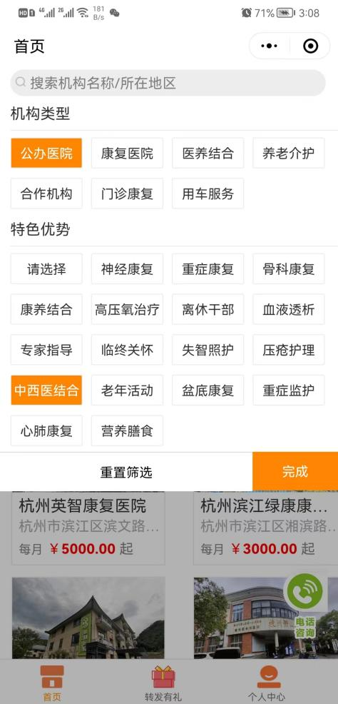 4、进入条件筛选界面,机构类型选择“公办医院”,特色优势选择“中西医结合”,点击“完成”,还可根据需求选择“距离”“地区”以及“价格区间”