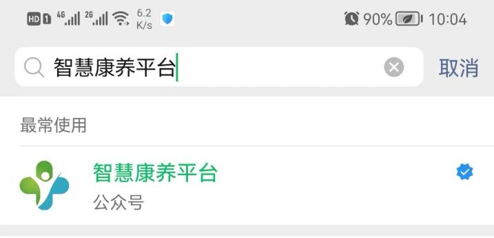 1、打开微信搜索,搜素“智慧康养平台”,点击并关注“智慧康养平台”