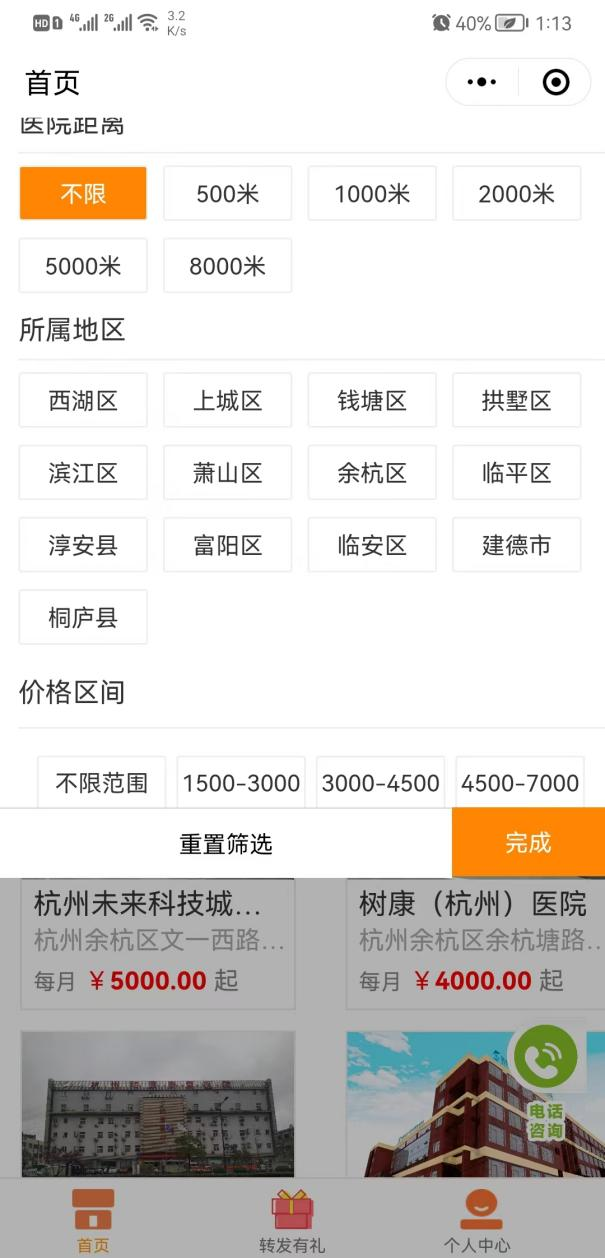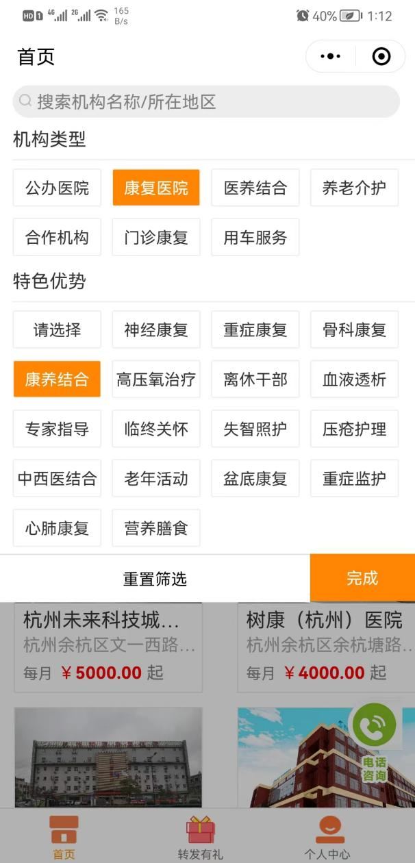 4、进入条件筛选界面,机构类型选择“康复医院”,特色优势选择“康养结合”,点击“完成”,还可根据需求选择“距离”“地区”以及“价格区间”