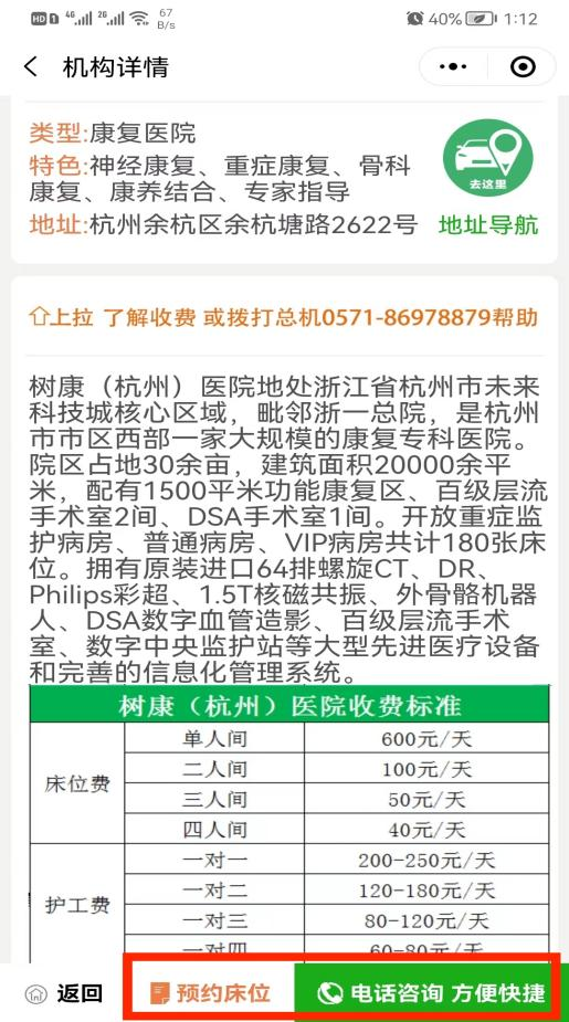 6、点击医院名称,进入该医院详情介绍页面,了解详细信息,在医院介绍页面底部可预约床位或电话咨询