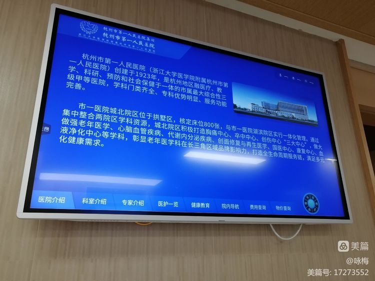 走廊墙壁上挂的电视机上有一句话引起我的注意:杭州市第一人民医院创建于1923年,到今年不正好一百周年?百年老医院,值得庆祝一下的!