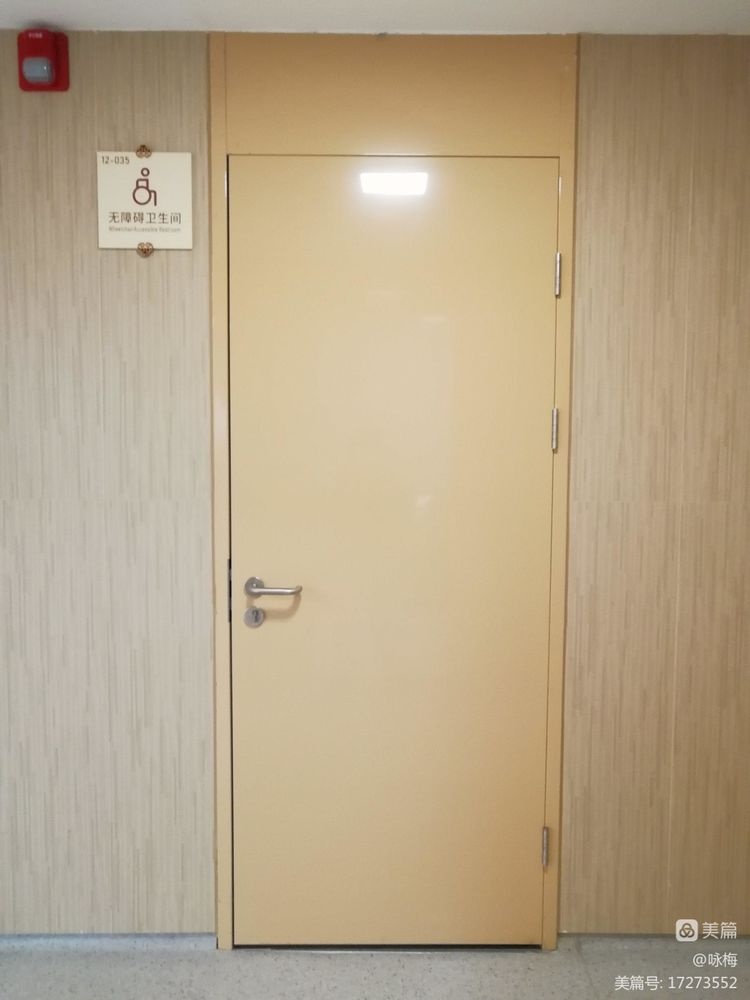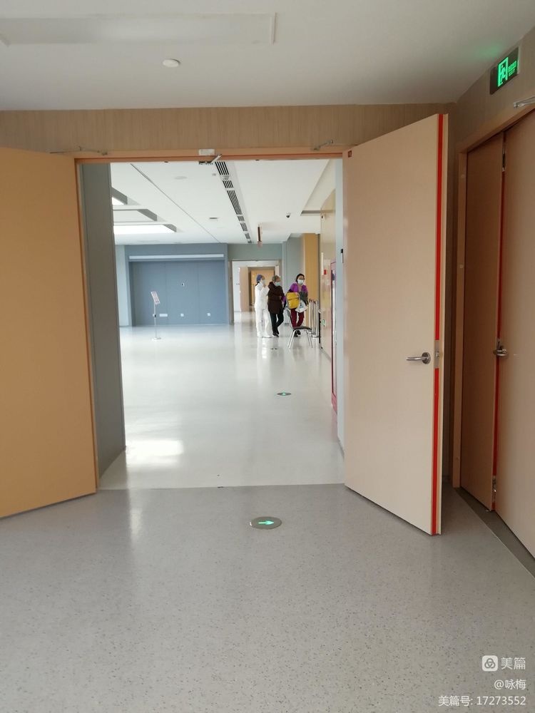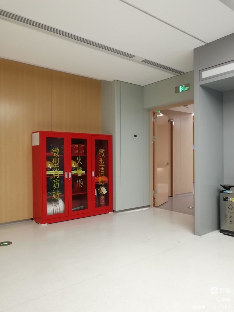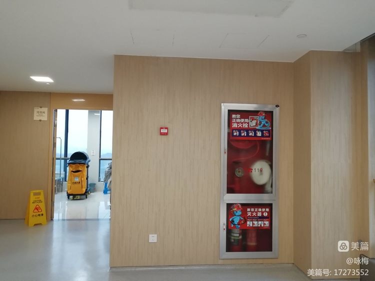 走廊整个墙上贴的是仿木材纹的墙砖,而不用板材,只有两个病房中间放消毒液那面约80cm宽的墙面用了板材。处处体现消防安全,预防第一!住在这样消防防守严密的医院病房里,安心睡吧!