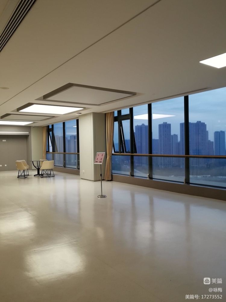这间休息室真大,摆有桌椅。病区长廊走下来,有点累了,我常在这里歇歇脚,看看室外景色,心情大好!