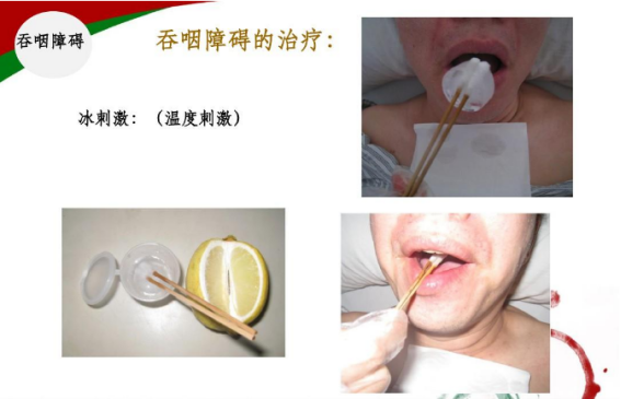 冷刺激能有效地强化吞咽反射,反复训练,可使之易于诱发且吞咽有力。