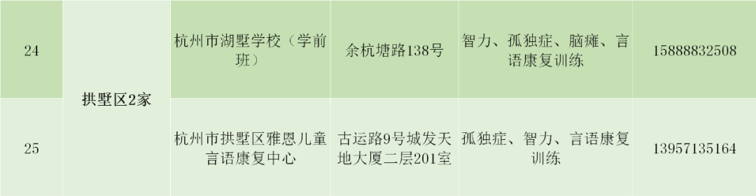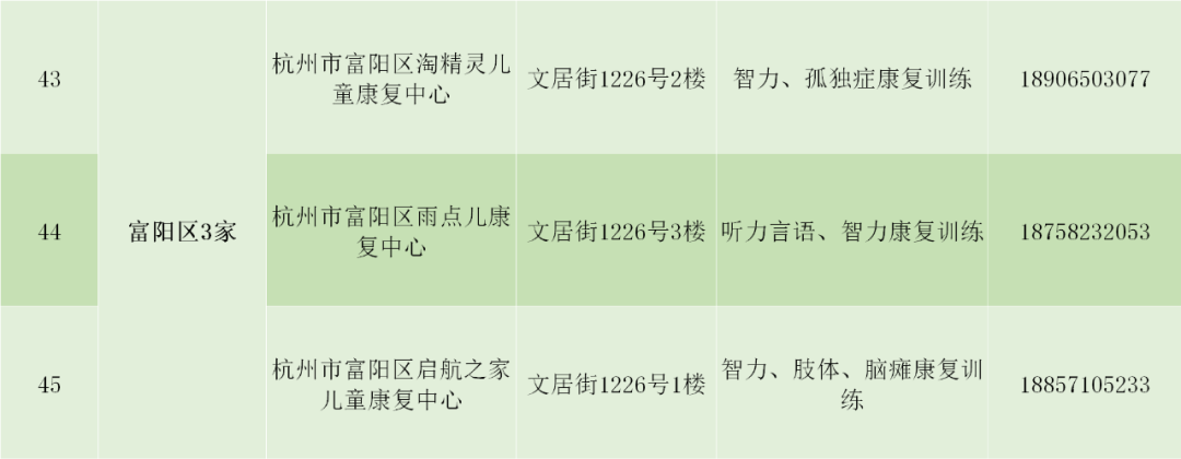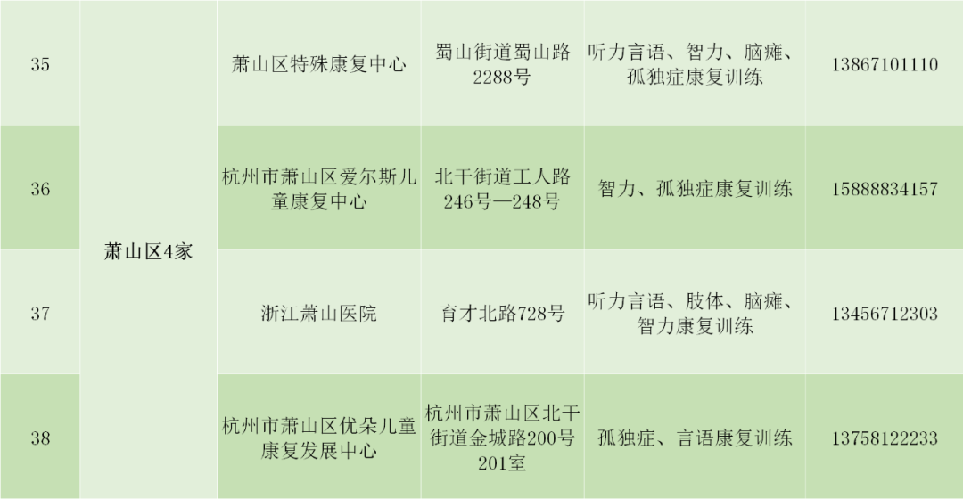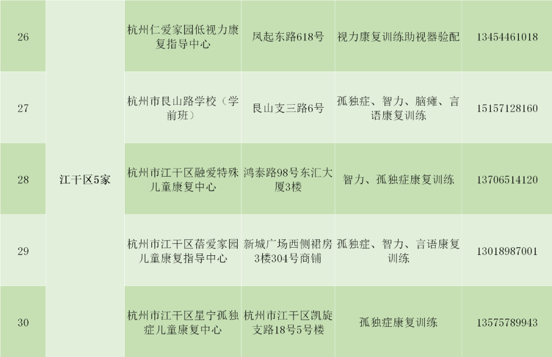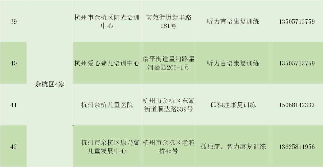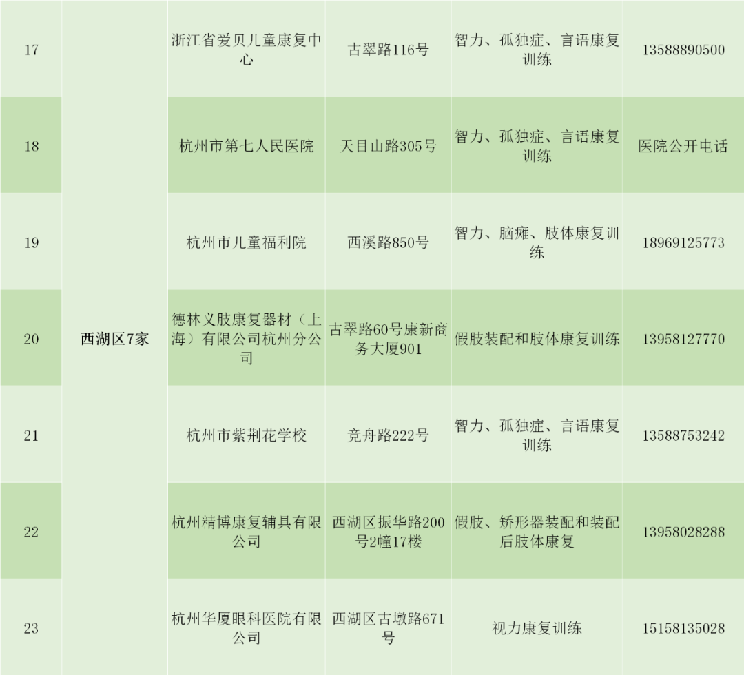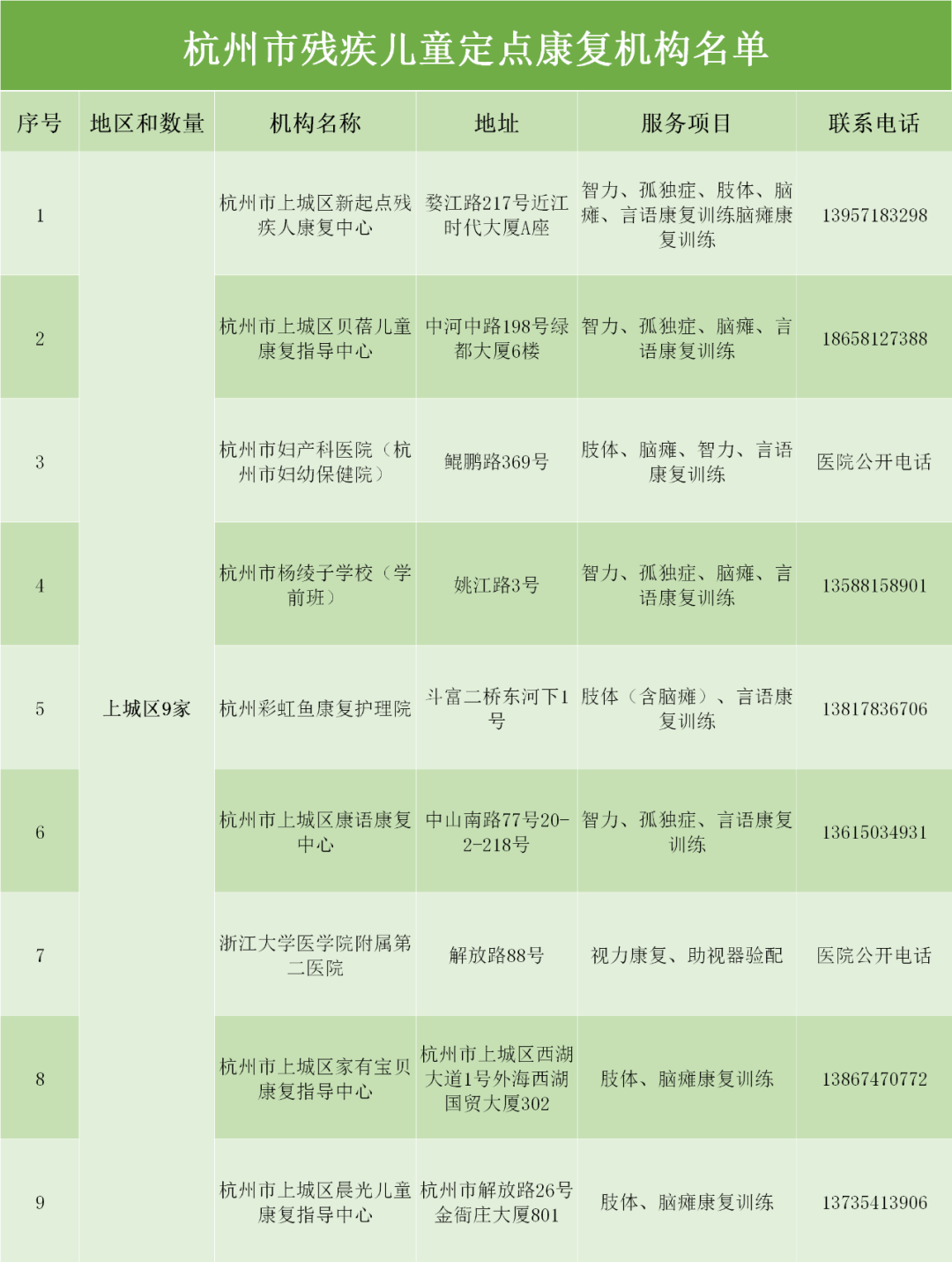 杭州市残疾儿童和孤独症儿童、言语障碍儿童在各类定点康复机构接受基本康复训练和治疗,可享受相应补助。杭州市残疾儿童定点康复机构准入实行省定标准,定点机构管理由市残联牵头,联合市卫健委、市教育局和市民政局共同开展。截止2020年7月,杭州市残疾儿童定点康复机构共49家,现将名单公布如下: