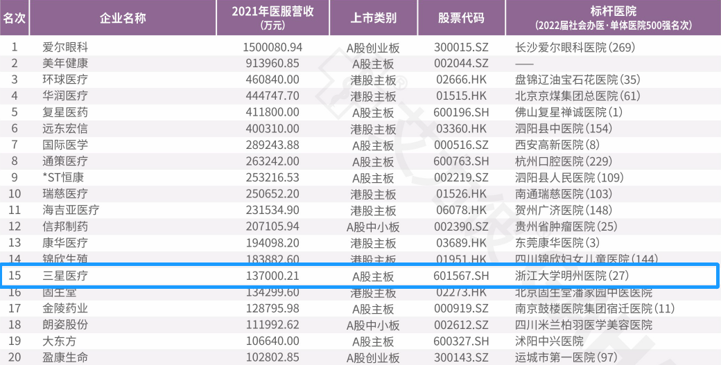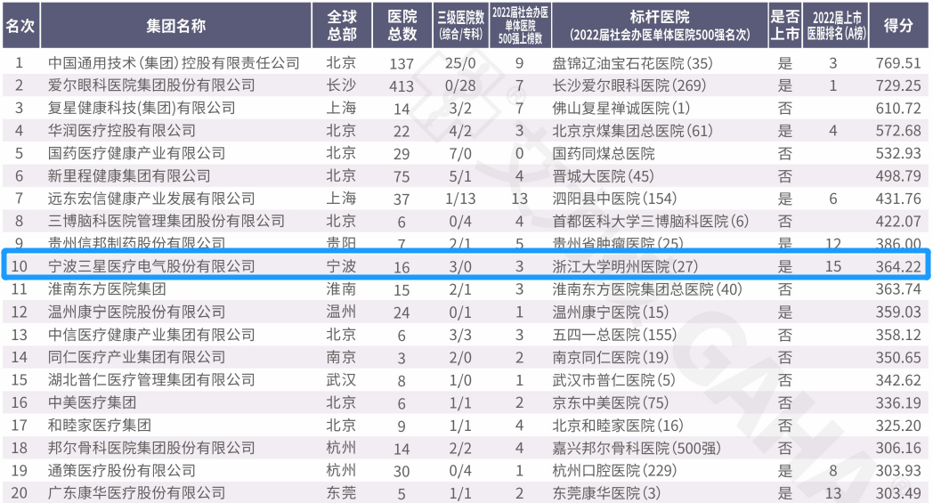 宁波三星医疗电气股份有限公司社会办医医院集团10强