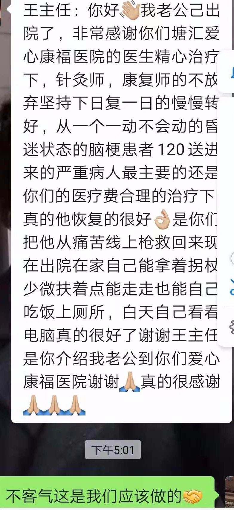 近日,嘉兴爱心康复医院收到了一封患者家属的感谢短信。患者家属通过微信将信息发送给我们护理部主任,虽然篇幅不长,但字里行间却能读出患者家属真挚的情感和满心的感激。