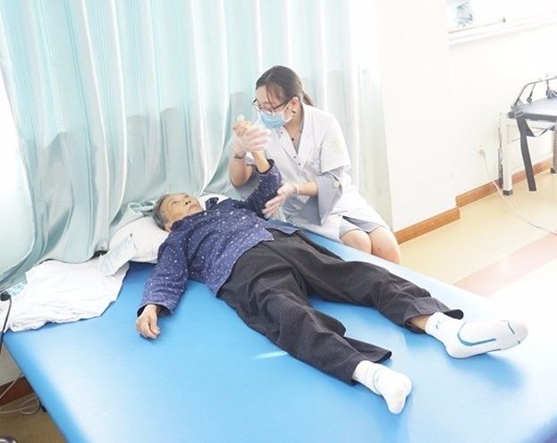 朱雪梅:她是由于中风了以后偏瘫,偏瘫了以后她关节不能动,所以我们给她进行肌肉的训练。