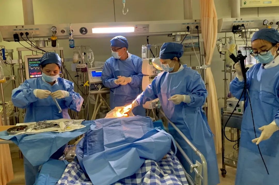 这位病人是名老年女性,当天误吸后突然呼之不应,出现急性呼吸衰竭,血氧饱和降至52%,医护人员从她气道内吸出大量胃内容物。必须紧急气管插管、留置胃管!病人被送至ICU后立即连接呼吸机,辅助通气治疗,同时深静脉穿刺、鼻肠管留置、纤支镜检查、送检CT等抢救工作也有条不紊地进行。