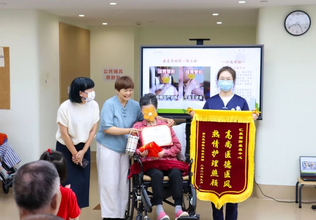 目前可拔出鼻饲管自主进食,自发语言增多,可正常与人问答沟通交流。同时陈阿姨也获得了汇泉康复医院第六次康复明星评选活动的康复卓越奖,患者和家属都露出了开心的笑容,并送上锦旗以表谢意!