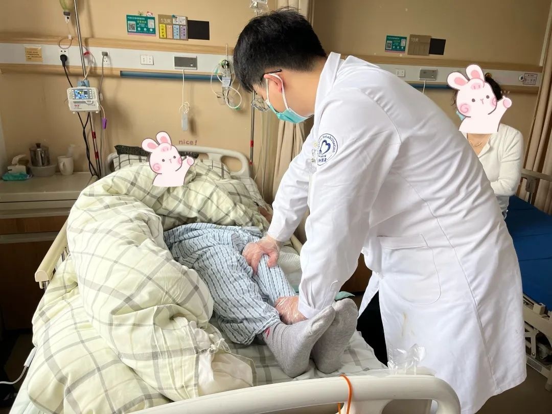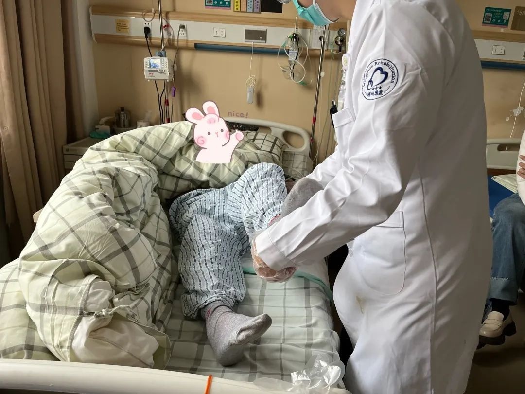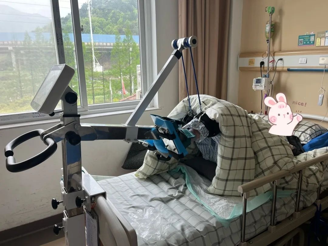康复科向友刚副主任给吉老先生的治疗措施是关节松动,肌力训练,有氧训练,缓解关节僵硬,经过小半月的康复治疗后,向主任评估吉老先生精神状态改善,可尝试第一次床边坐立。在向主任、康复师、三病区-忻红萍护士长的辅助下,吉老先生从床上坐到了凳子上,虽然只能坐一会,但这对于吉老先生来说已经是一次突破了。