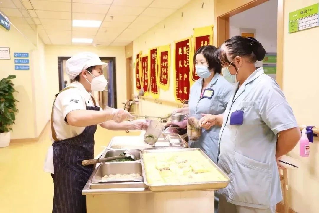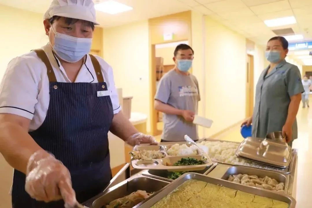 下午送餐的时间到了,配餐员们打好餐,推着送餐车把热气腾腾的饭餐送到每个病房门口。菜品荤素结合,争取让每位患者吃得饱、吃得好。