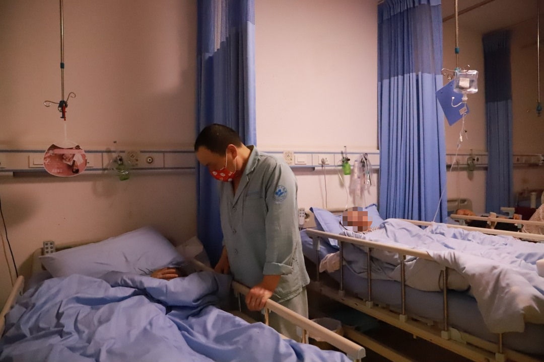 病区的病人们陆陆续续睡下了,护工大叔定期起床检查时,发现睡着的李奶奶被子不小心滑落,小心翼翼给她盖了上去;病区的夜班护士还在岗位坚守工作,定时到各病房查看病人的入睡状态及身体有无不适。