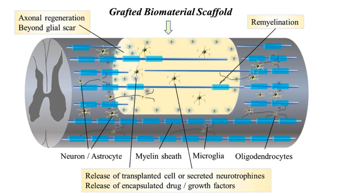 上图为生物材料支架移植后生理病理的变化,有些生物材料中含有干细胞、药物、神经营养因子或生长因子等。移植的生物材料可以作为支架,支持神经细胞在伤口处重新生长。移植的生物材料支架会释放移植的细胞或分泌的神经营养因子,也会释放包裹的药物或生长因子等。它们有助于形成新的神经元连接和突触,连接受伤的神经细胞和周围神经元。此外,移植的干细胞能产生少突胶质细胞,使受损的神经细胞重新长出髓鞘。这些再生和重新髓鞘化的神经细胞穿过伤口,并与其他宿主神经细胞连接,以改善脊髓损伤后的形态学和行为结果从而改善神经生长的微环境,为后续脊髓损伤恢复建立基础。