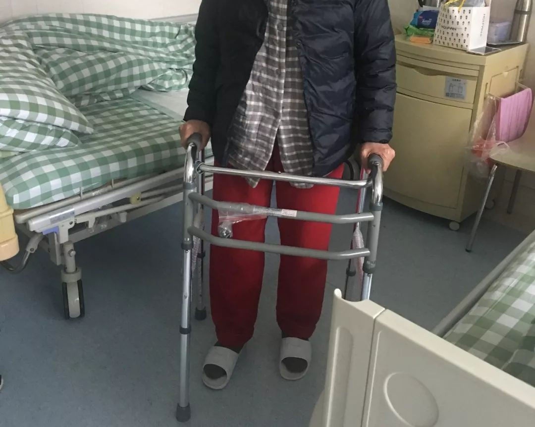 患者住院三周,已经可以在助行架的辅助下进行短距离步行,在出院后继续进行康复训练,在两到三个月内逐渐过渡到双腋拐辅助步行→单手杖辅助步行步行→独立步行,完全可以应付在家庭内的自我护理。