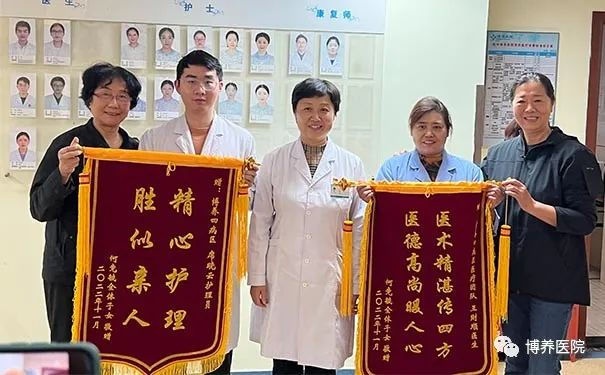 母亲最后的一段时间,博养医院的医生护士都尽心尽责,主管医生王财顺也及时和我们沟通病情,让我们能在母亲身边尽心尽孝。还有病房的阿姨每天的护理都非常用心,把老人护理得非常干净,没有一点异味。为此在把母亲接回家后,我们特意为王财顺医生和席晓云阿姨送来两面锦旗,感谢他们和病区医护人员的医者仁心和无微不至的关怀。